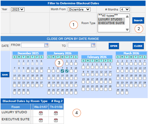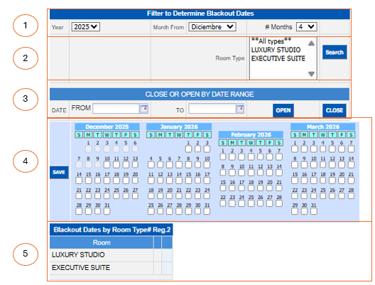 Novohit allows you to close the sale of any future night, to do this you must enter: Front Office → Sales → Blackout Dates Management