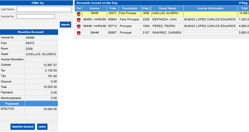 Reactivate Account cancels the invoice and reactivates the room, this will happen only if the invoice is of the day and in case the room is not occupied.