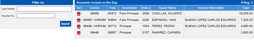 On the right side you will see a list of the invoices that have been issued during the day, where you can select the one you wish to cancel by clicking on the Trash icon.