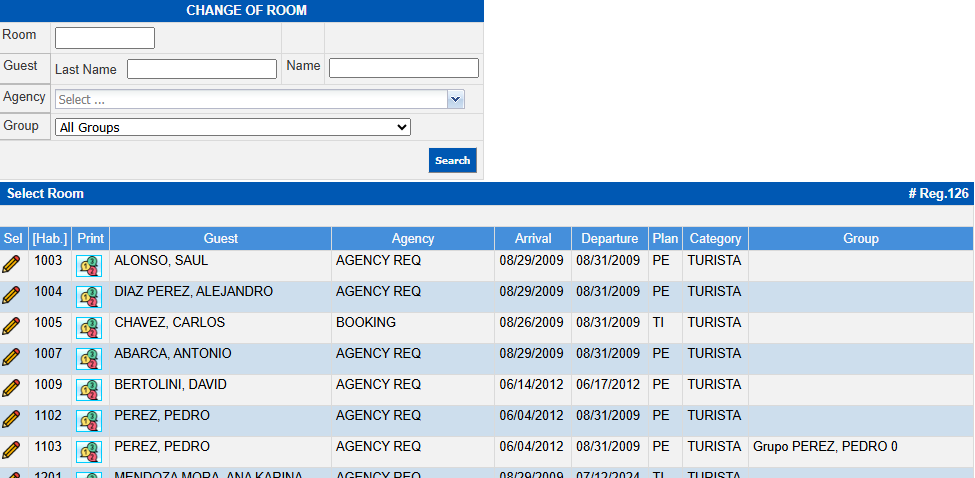 Group: Allows you to filter records that belong to a specific group or to view all stays, facilitating room changes in group scenarios.