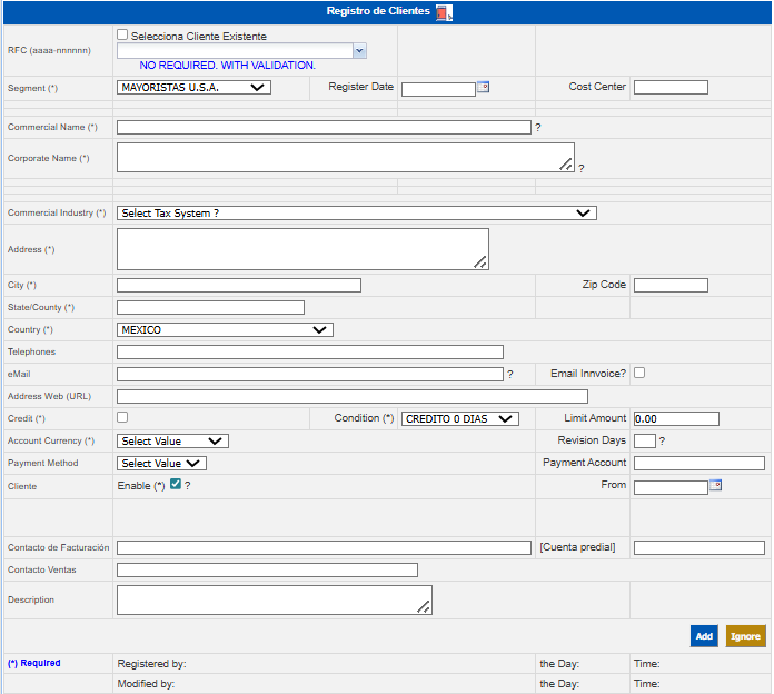 To enter new client information, the following steps are performed:Click the Insert icon in the Customer Registered section.Enter the information corresponding to the customer in the Register of Customers window in the fields: