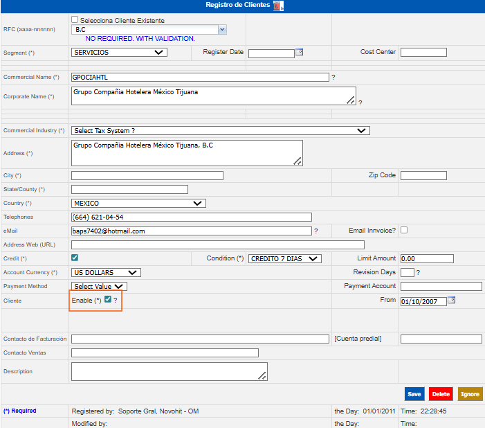 Enable* | Click on the check box to make the customer active (make invoices, transactions, etc.). By removing this option, the customer will not be displayed to perform any operation with his account. |