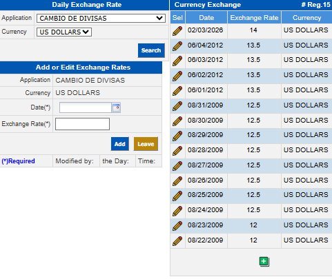 The past dates can only be consulted; however, the current date and a future date can be selected for modification. It is suggested not to modify the Exchange Rate during the day, to avoid discrepancy in the amounts of the reports and the accounting entry.