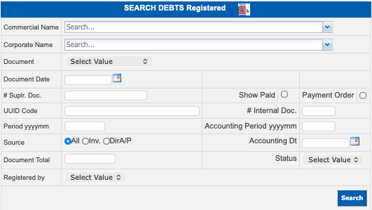 In the SEARCH DEBTS Registered section, the initial screen of the Register of Debts and Transactions application is displayed, where the Debts of the period/month and subsequent periods are searched according to the data entered in the fields.