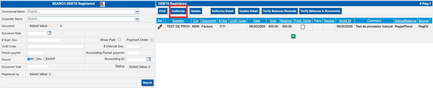 Confirm the authorization of the debts by clicking on the Authorize button.