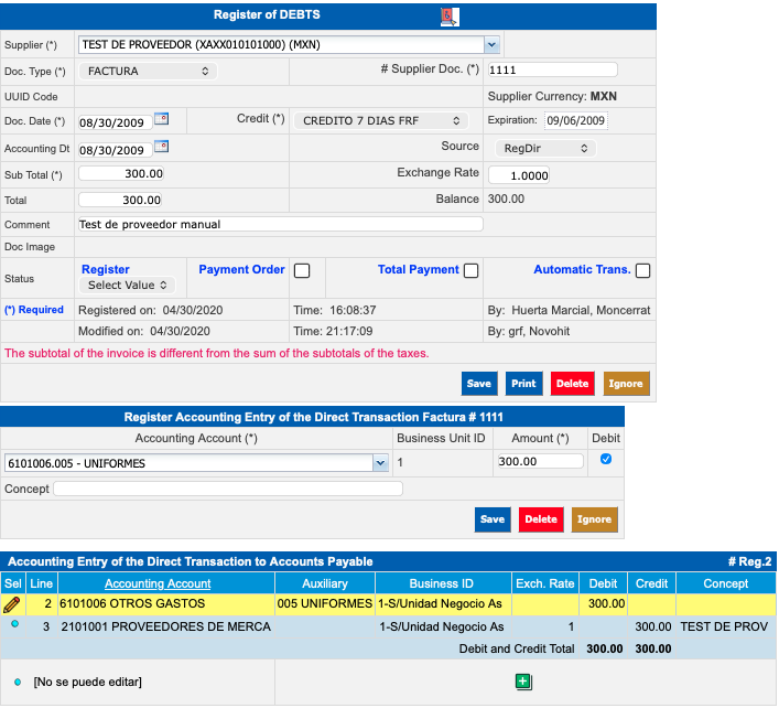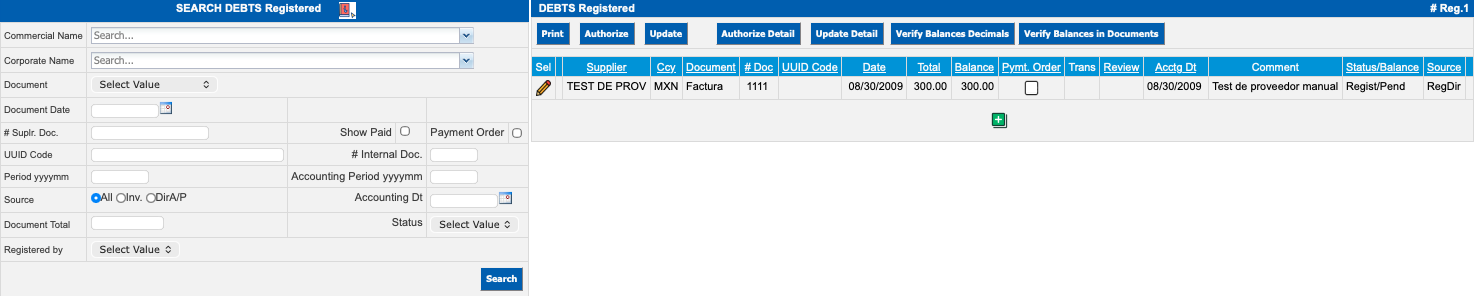 It is necessary that the accounting entry of the debt registered is balanced in order to perform the authorization process; if the accounting entry of the debt is not balanced, the Accounting Accounts Not Verified icon appears and must be corrected in order to continue. After performing the authorization, the debt can be modified by following the steps indicated, the authorization process must be completed before the update process can be performed.