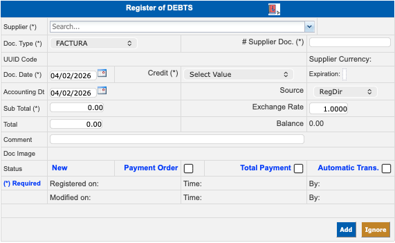 Go to Administration → Accounts Payable → Register of Debts and Transactions