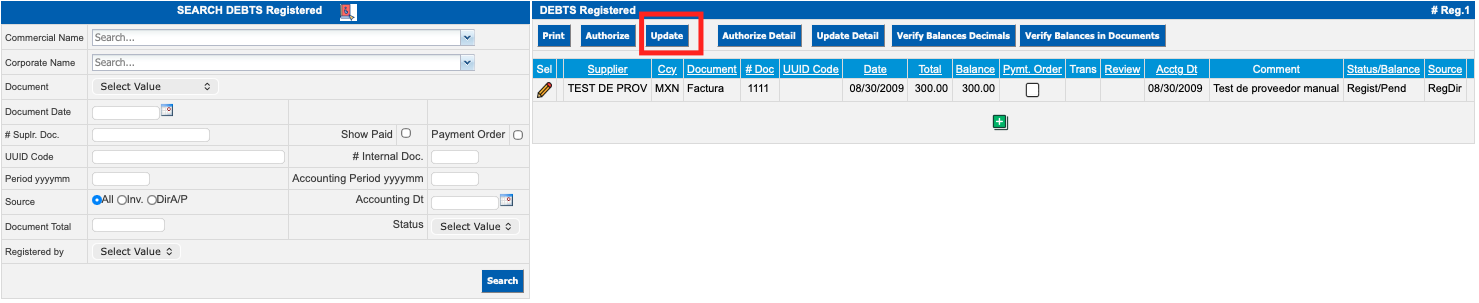 The debts must have an authorized status. Updating can be done individually (a single debt) or by groups (several or all debts at once).