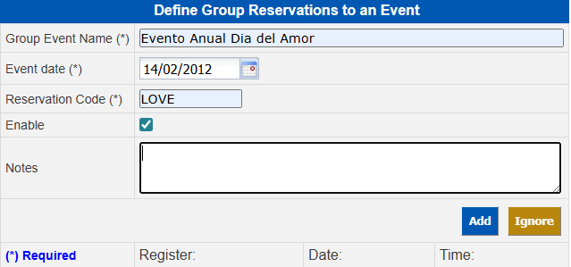 In the Define Group Reservations to an Event window enter the following fields: