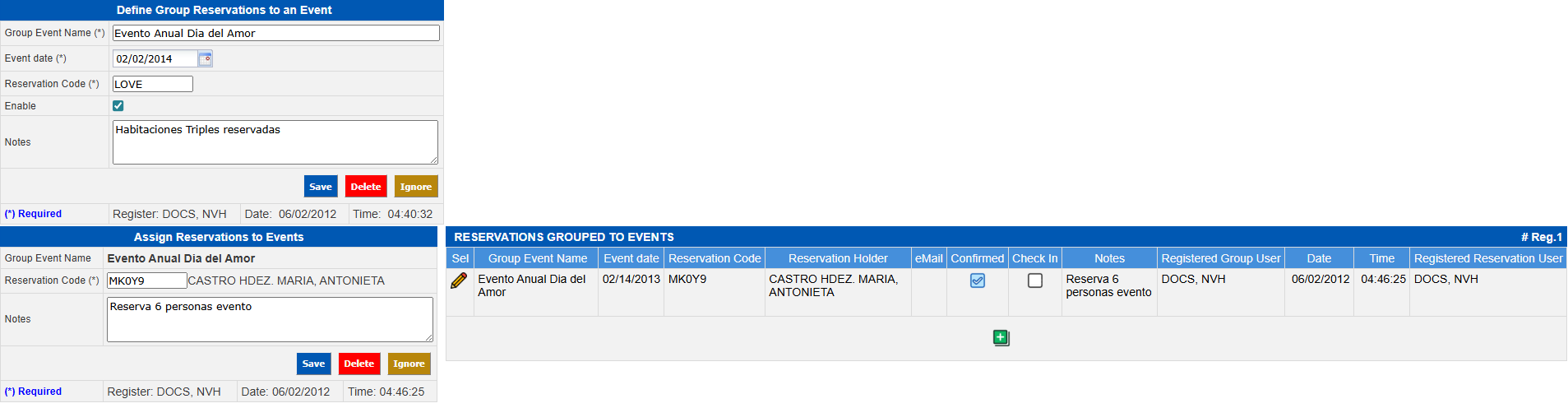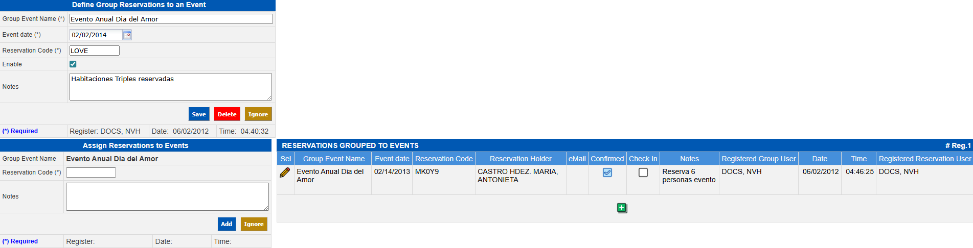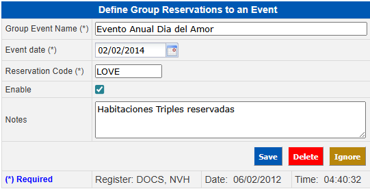 To assign reservations to groups or events already registered, the following steps must be taken go to Front Office → Reservations → Define Groups of Rooms Reserved for Events.