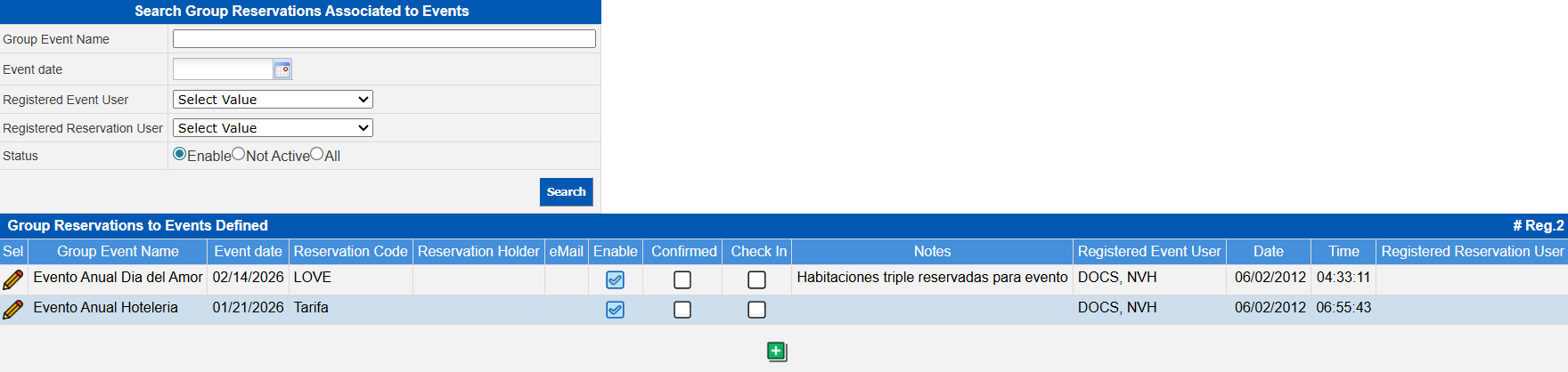 The search will be performed with the data entered (they are not mandatory fields so they can be all or some of them) and the information will be displayed in the window of Group Reservations to Events Defined