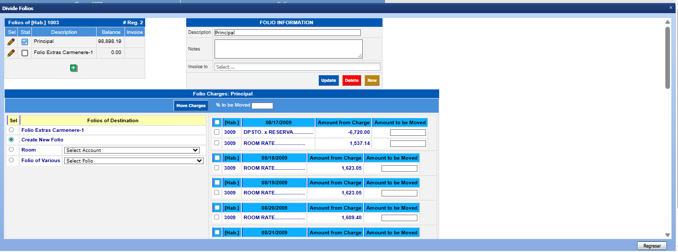 % to be Moved: indicate the percentage you wish to move, you may write any percentage, this will apply to all the charges of that folio.
