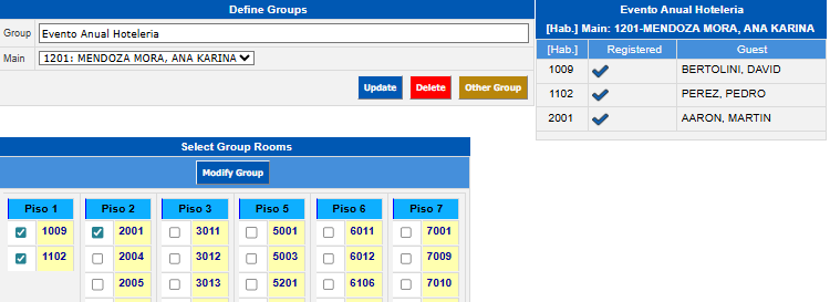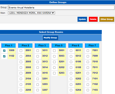 The Select Group Rooms window will be displayed where you will see all the rooms that are registered and do not belong to another group, select each of the rooms that belong to the group and click on the Modify Group button.