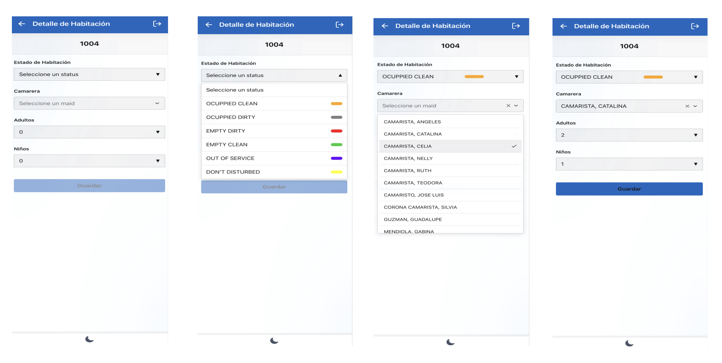 - Within the room you can indicate the status to assign and the name of the maid/housekeeper.