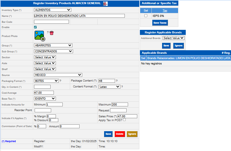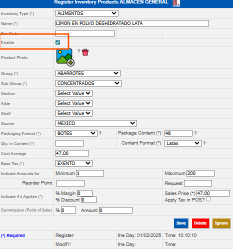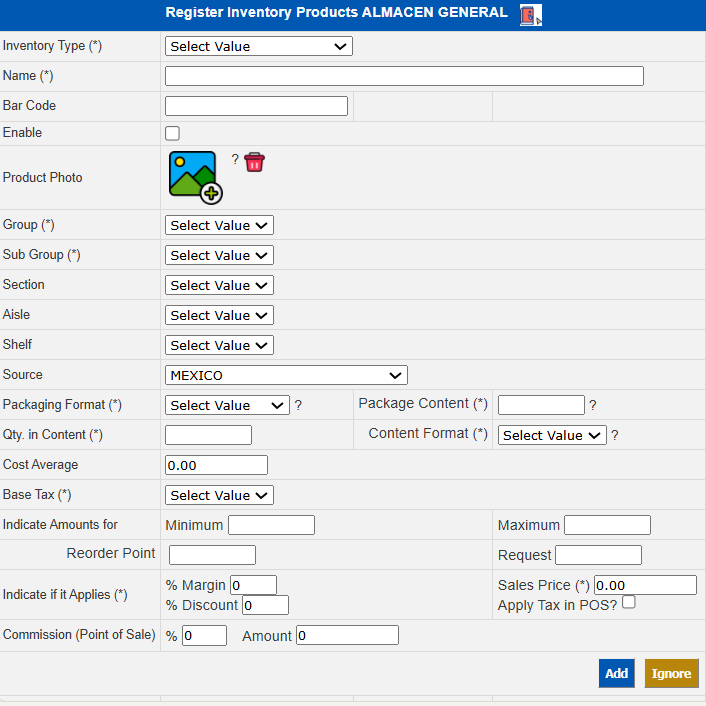 Indicate if applicable * Selling Price | When it applies that the product is for sale, enter the selling price. |