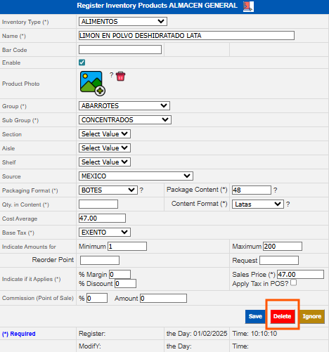 Section | Allows classifying the product within a specific section of the warehouse/establishment. |