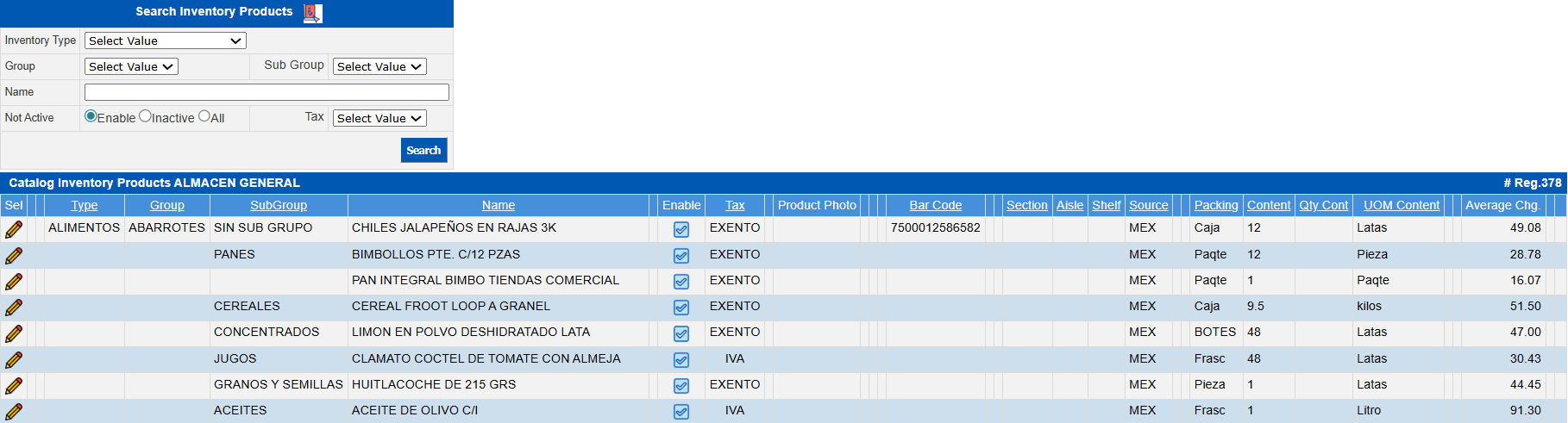 Enabled | By checking this check box you are requested to show the products/items that have had movements but are deactivated, i.e., they are not active. |