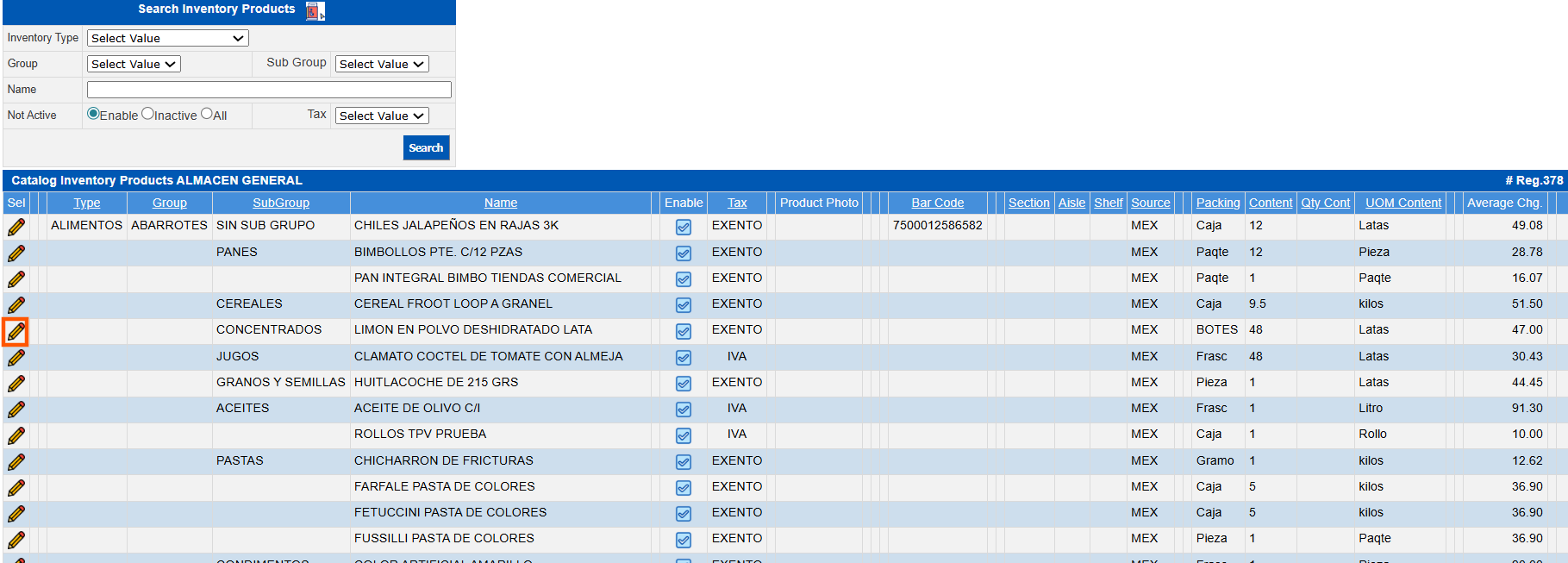 Enable | By checking this check box you are requested to show the products/items that have had movements but are deactivated, i.e., they are not active. |
