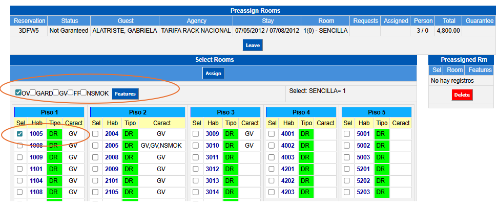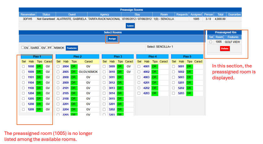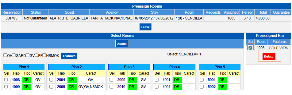 To delete the preassigned room (to change it for another one leaving the reservation without preassignment), you must select it from the right section Preassigned Room and click on the Delete button, this will free the room leaving it available to be used in another preassignment or Walk-In.