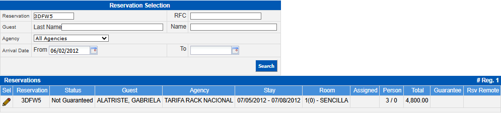 This section, by default, shows all future reservations starting from the current date. This list will show the reservation you are looking for as indicated in the previous step and you can select it to preassign a room by clicking on the Pencil icon.