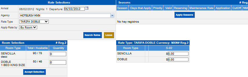 The available room types will be displayed in the lower left window, you must enter the number of rooms in the room type to be registered and click Accept Selection.
