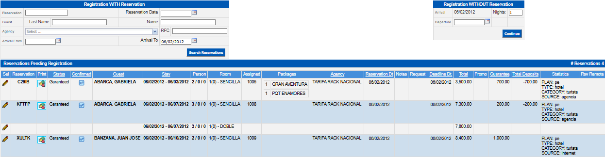 To register a group there are two ways, the first one is gradually as the guest arrives and the second one is express; to make a group registration in both cases, go to Front Office → Reception → Register Guest or GroupWhen entered, you will observe a screen with three sections, in this case (Registration WITH Reservation) only the two aligned to the left will be used: