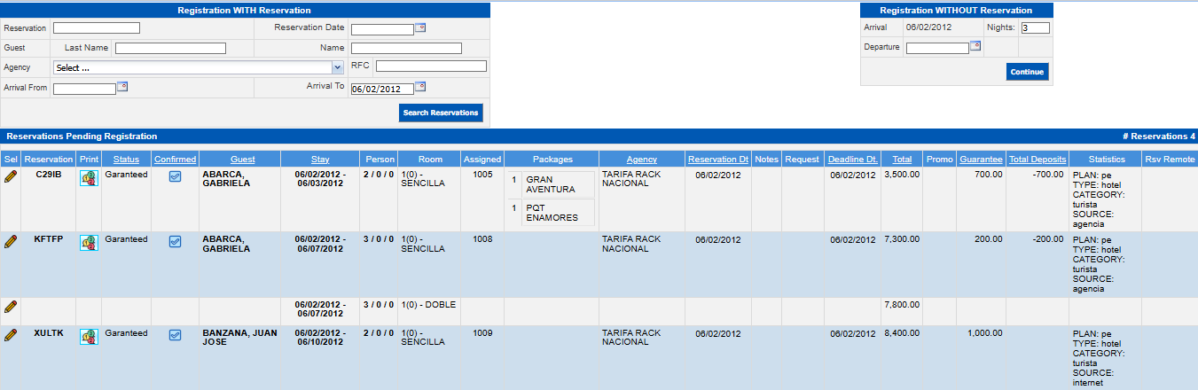 When you enter you will see a screen that includes three sections, in this case only the Register WITHOUT Reservation window will be used, since the client does not have a reservation code.