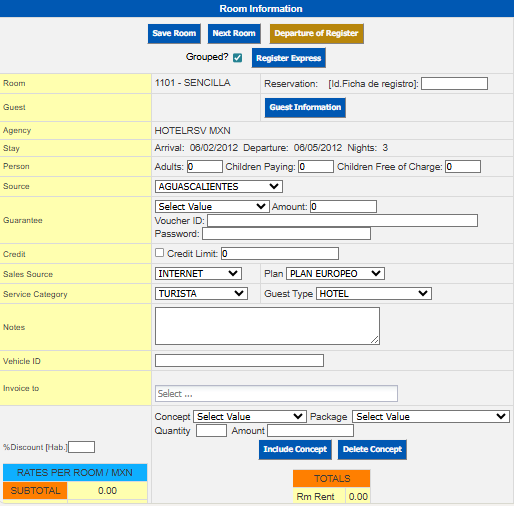 It will open the Room Information window where you will need to add the guest information, payment method, source, etc.