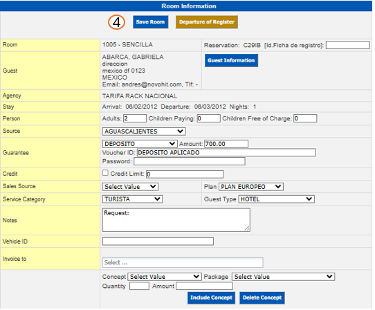 Once you have reviewed all the information of the stay, number of people, payment method, source, etc. You will have to click on Save Room, with this you will have concluded the registration process of a Guest