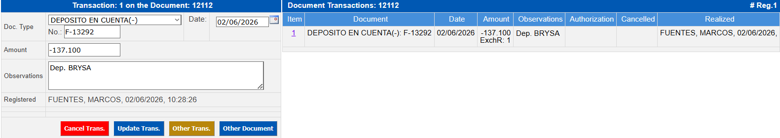 Field Description Docum. Type Select the type of document by clicking on the inbox. No. Number of the document you are entering. Date It will show the current date, however it can be changed (it allows to capture within the open period any day, but that the accounting entry of that Accounts Receivable day is not generated). Amount Indicates the amount of the transaction to be entered. Comments Comments related to the transaction being entered.Press the Save Trans. button.