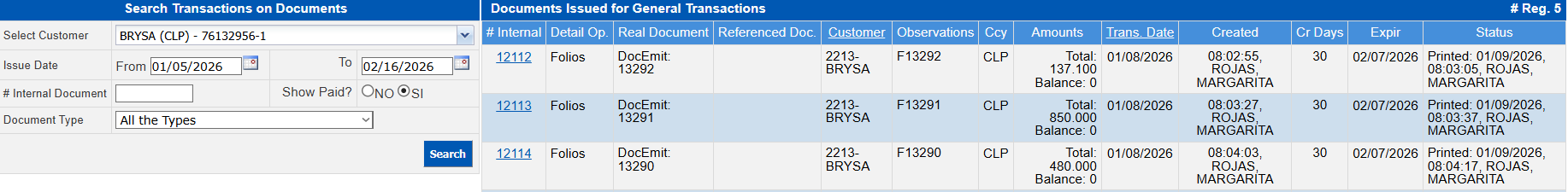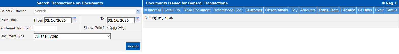 Field Description Select Customer Select a specific customer or all of them. Issue Date Search period From - To. # Internal document Specific invoice number you wish to search for. Show Paid Define whether or not to show paid invoices. Document Type Select the type of document you wish to search for.Press the Search button.After selecting the invoice, in the Document Transactions: #### section, click on the Item number in the Item column to modify the fields that will become available in the Add Transactions on Document: #### section.