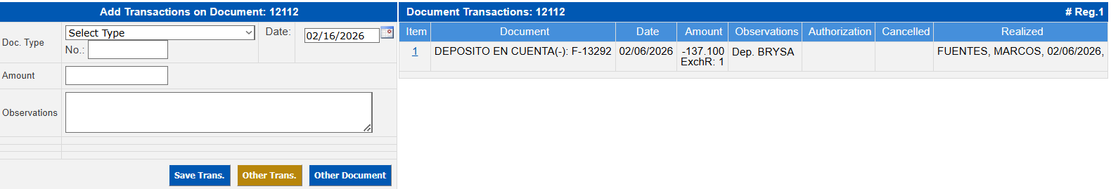 Allows registering a new transaction (payment, check, credit note, debit note, among others) applied specifically to the selected document.Document Transactions:
