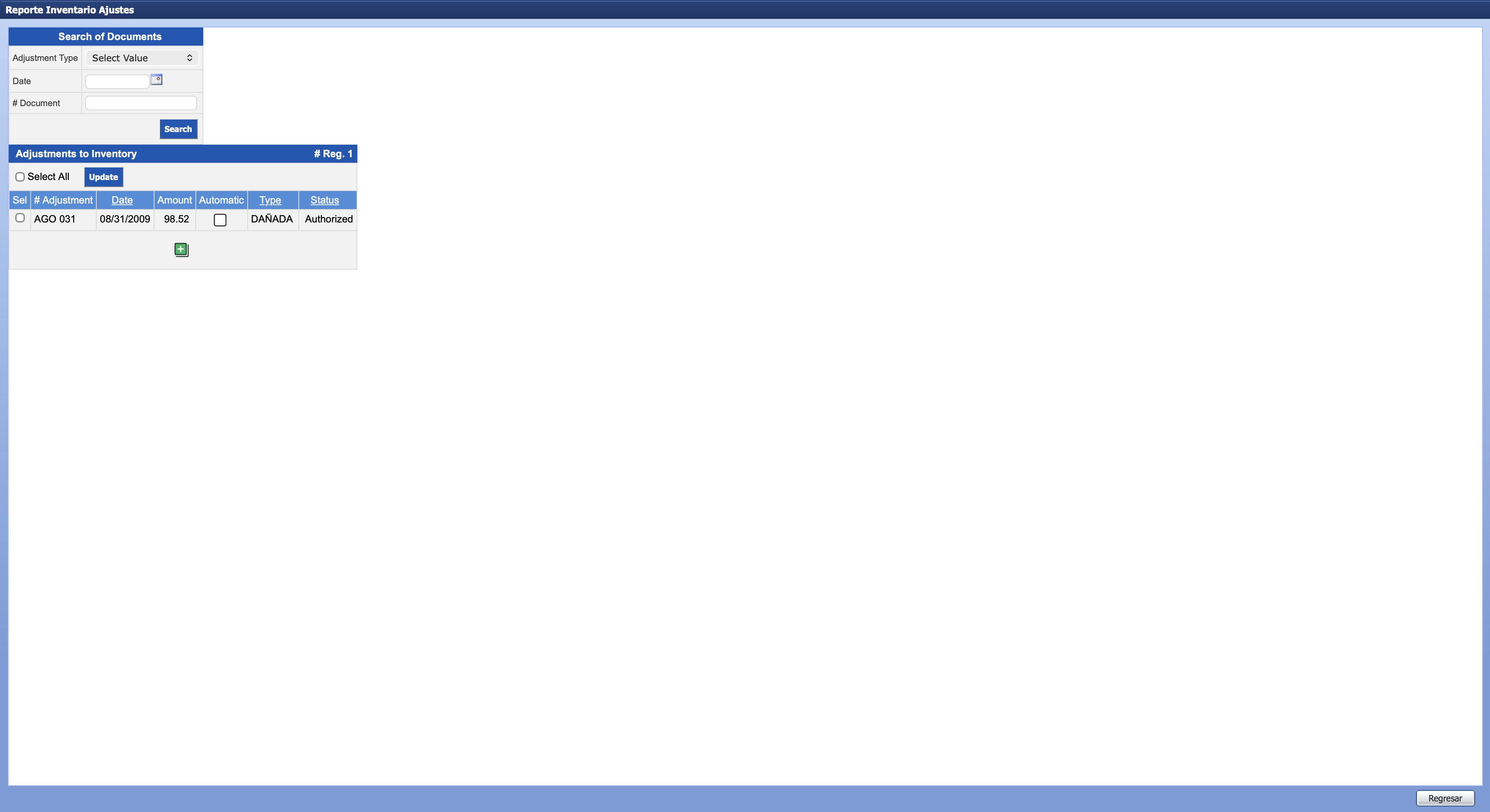 The window Inventory Adjustment will open with two sections: Search of Documents and Adjustments to Inventory.