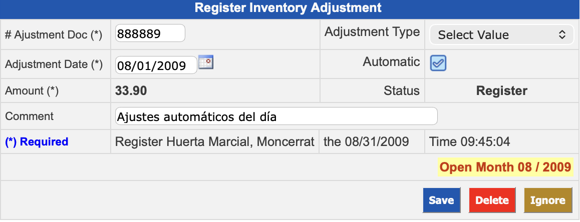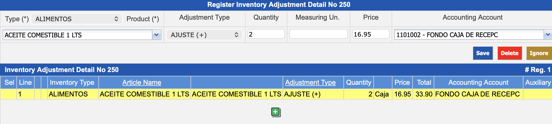 Register the detail of the adjustment in the section Register Inventory Adjustment Detail No. XXX by entering the corresponding information from the following fields: