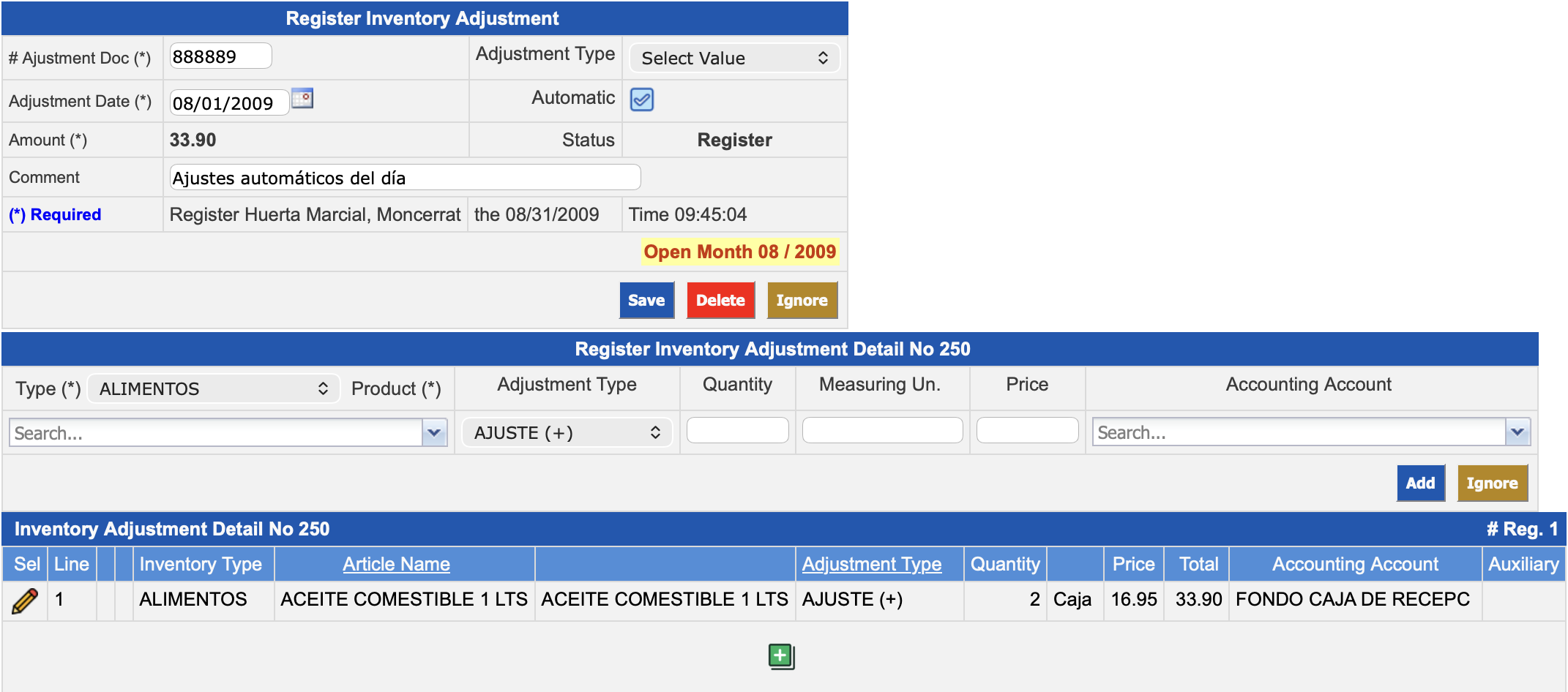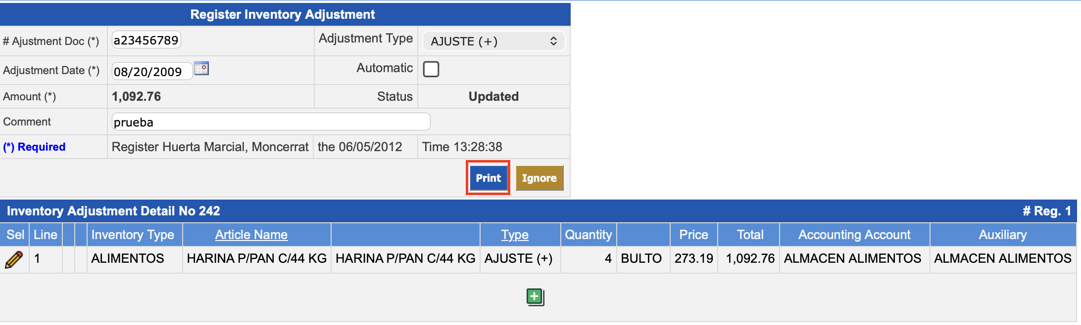 In the Inventory Adjustment Detail No. XXX section, the products with the adjustments already entered are displayed.