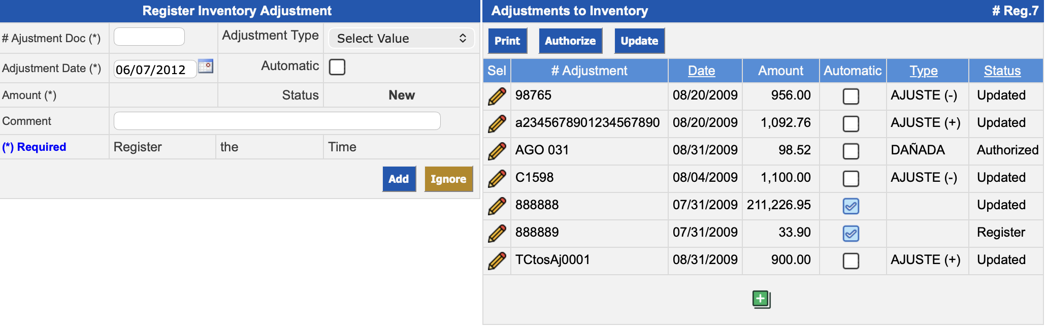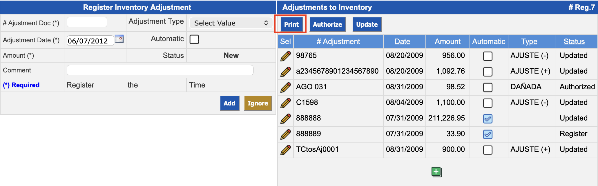 Adjustments to Inventory: the adjustments already entered are displayed, allowing you to view them according to date, type and status filters. In addition, massive actions can be performed by executing the Print, Authorize and Update buttons to the adjustments.