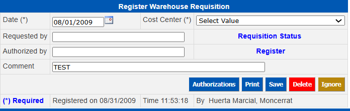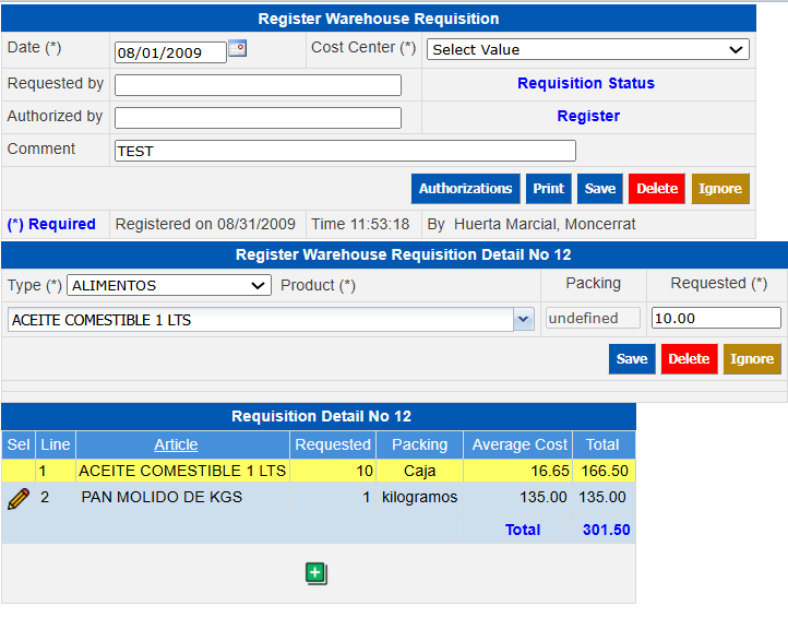 Enter the details of the requisition in the section Register Warehouse Requisition Detail No. XXX by typing the corresponding information from