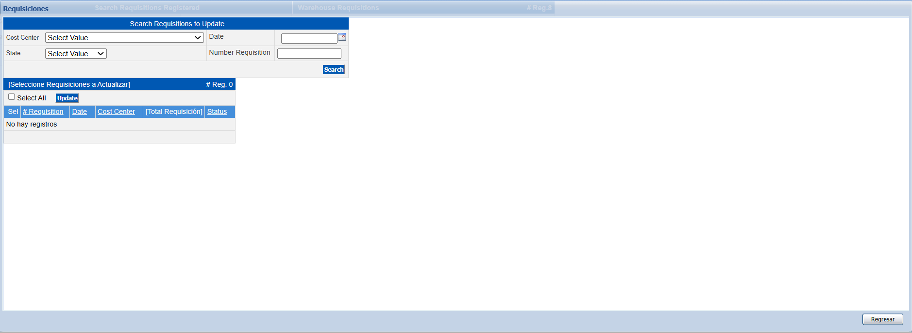 Search Requisitions Registered: Allows searching for previously registered warehouse requisitions.