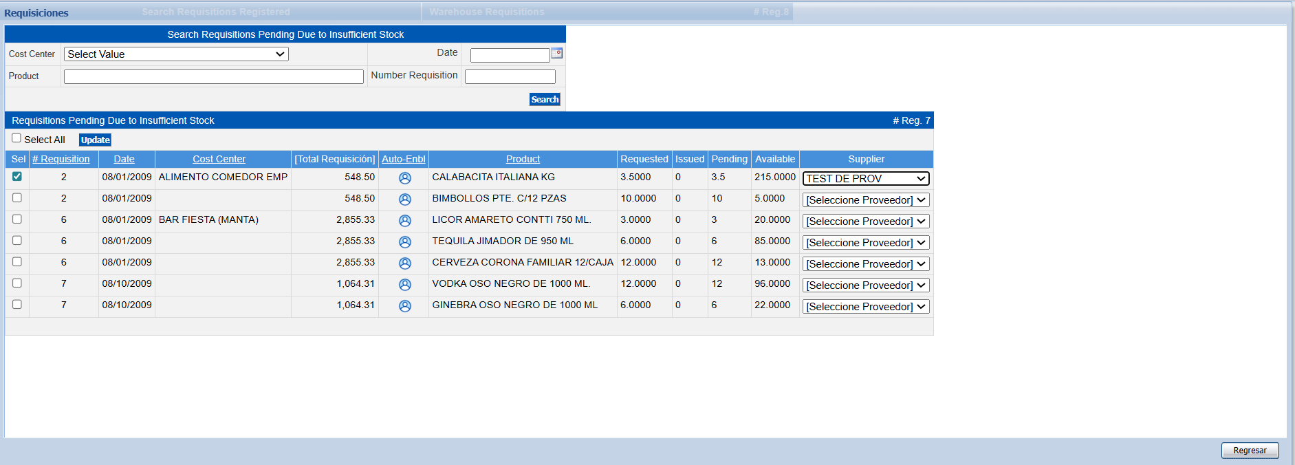 Search Requisitions Pending Due to Insufficient Stock: Allows searching for previously registered requisitions.
