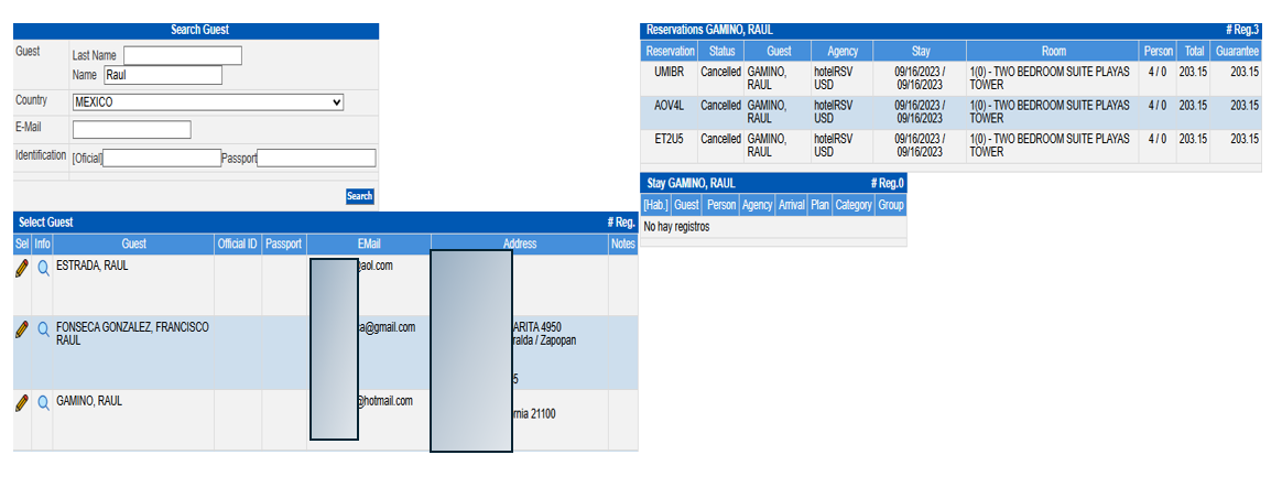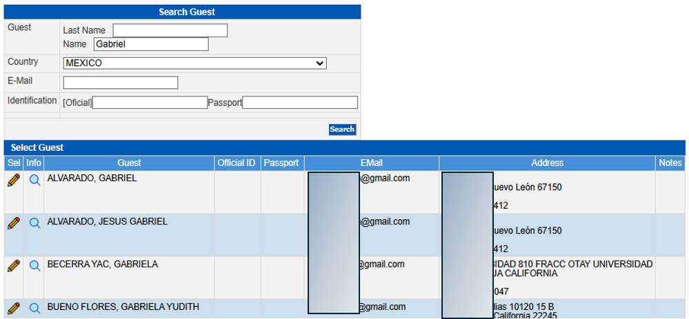 In this section you will enter the guests in the Rooming List section, click on the Guest information button, this will open the guest history query: