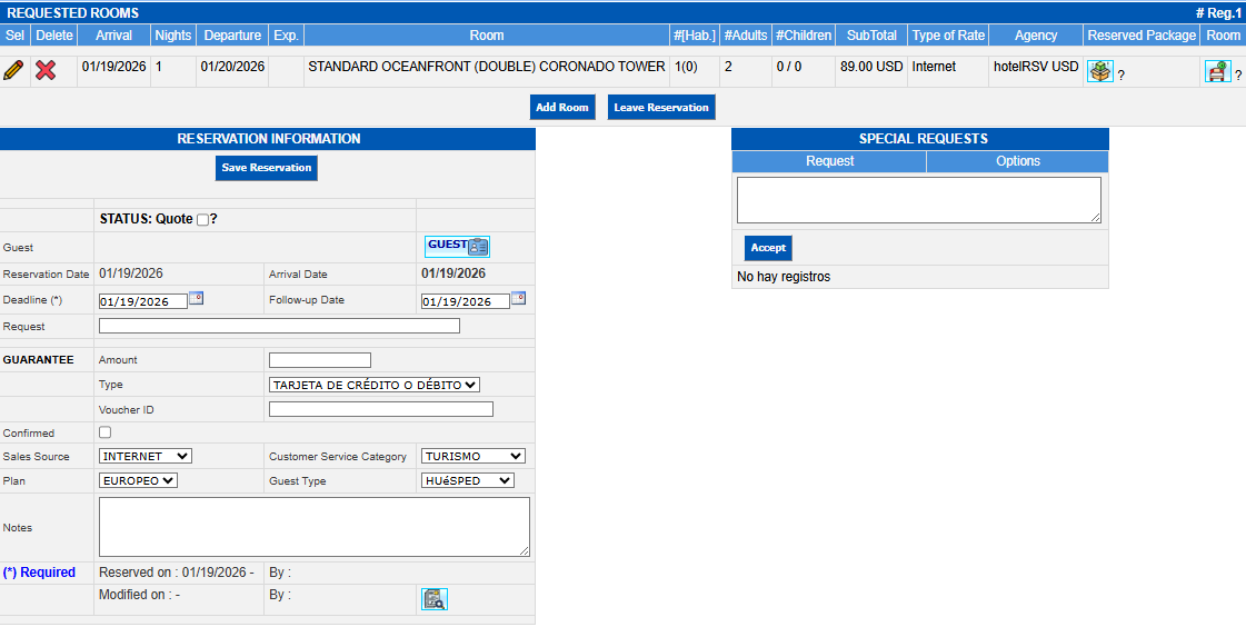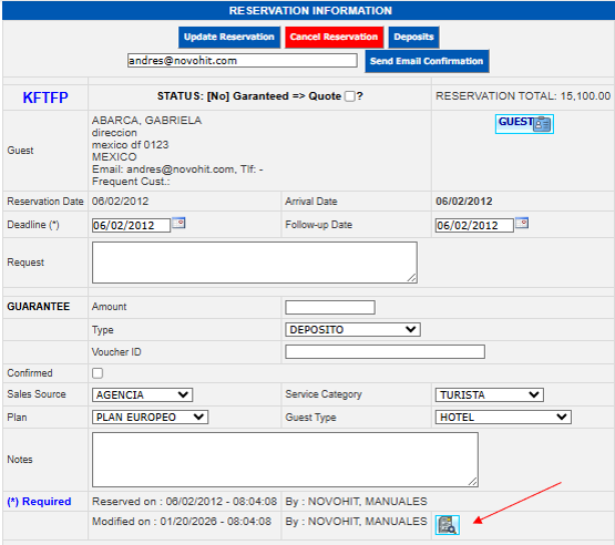 To modify the general data of the guest, agency or company, guarantee and payment method, as well as sales source, meal plans, category of service and guest type you can do it directly in the corresponding field and execute your changes.