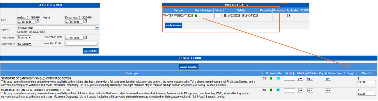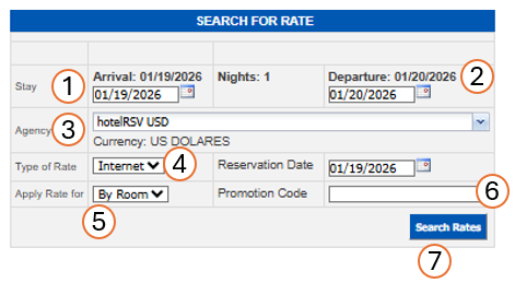 Verify the agency or company, rate type and room type, click on the Search Rates button.