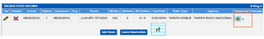 In the Requested Rooms Section, you will see the general information of the reservation, on the right side there is an Icon called PQT (package) click on it.