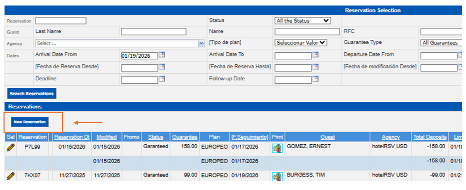By clicking on the New Reservation button, a new section will appear on the screen: