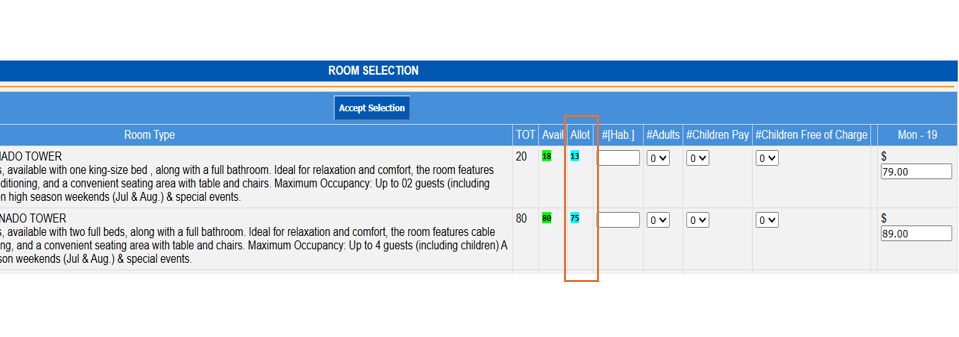 Type in the number of rooms to be booked and click OK Selection, you will be able to select the number of rooms you want and available for each room type.