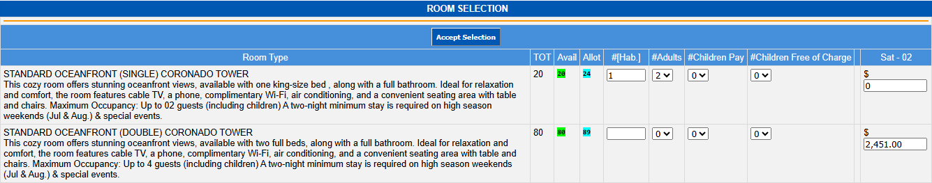 Type in the number of rooms to be booked and click on Accept Selection