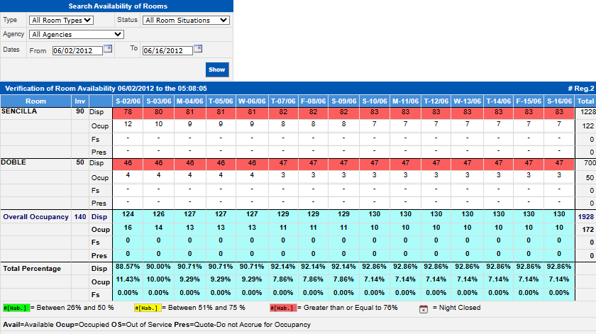 The legend located at the bottom of the report indicates the percentage level of the total rooms by room type, which is represented by colors to facilitate visual interpretation: