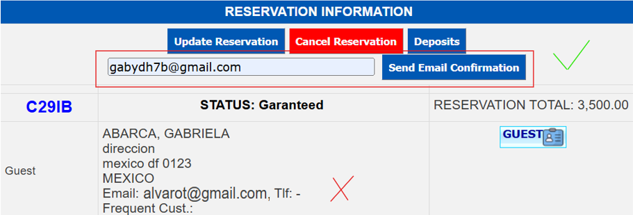 It is important to note that if an email address exists in the guest’s data but a different address is entered in the field next to the button, the confirmation email will be sent exclusively to the address specified in that field.