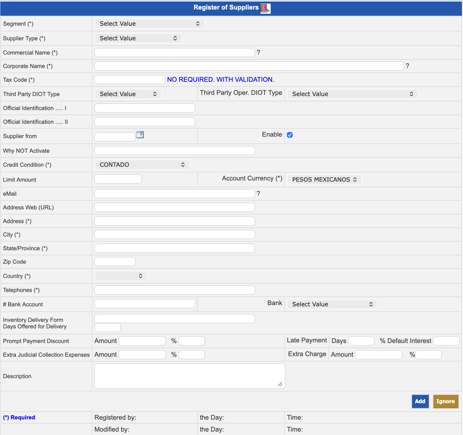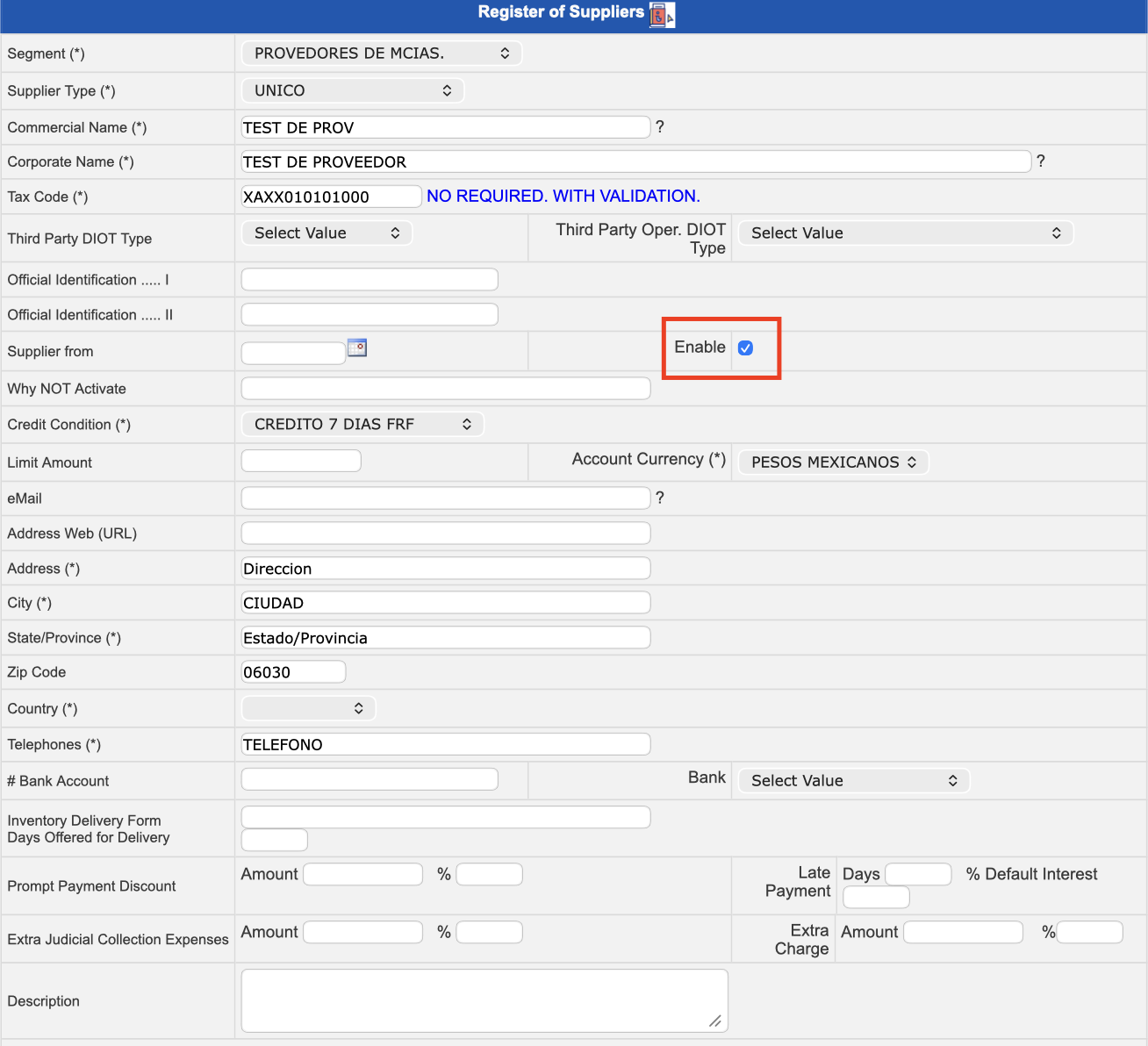 | Enable * | Click on the check box to make the supplier active (make invoices, transactions, etc.). By removing this option, the supplier will not be displayed to perform any operation with your account. |