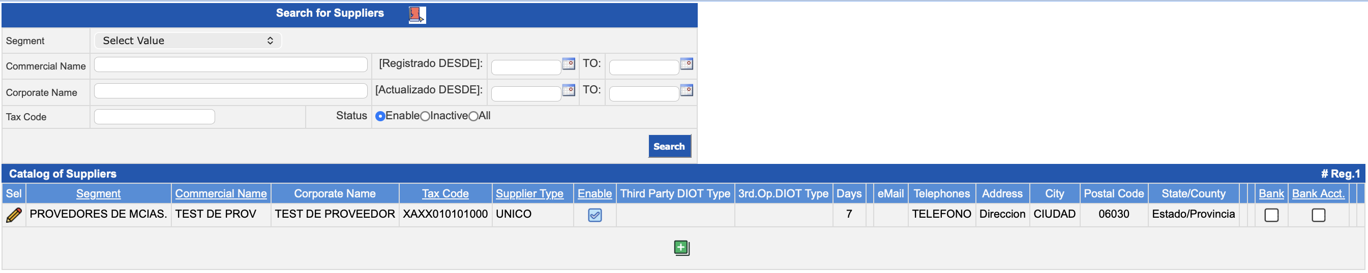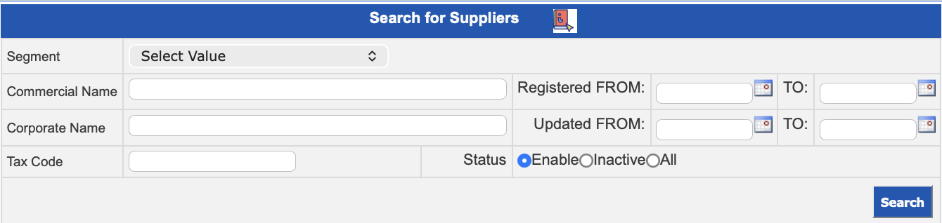 Field Description Segment Select the segment from the drop-down list to which the supplier you wish to search for belongs. Commercial Name Enter the company name or establishment name. Corporate NameLegally registered name for tax, legal, commercial, etc. purposes. Registered FROMAllows filtering suppliers by a date range, identifying those that were registered within that period.